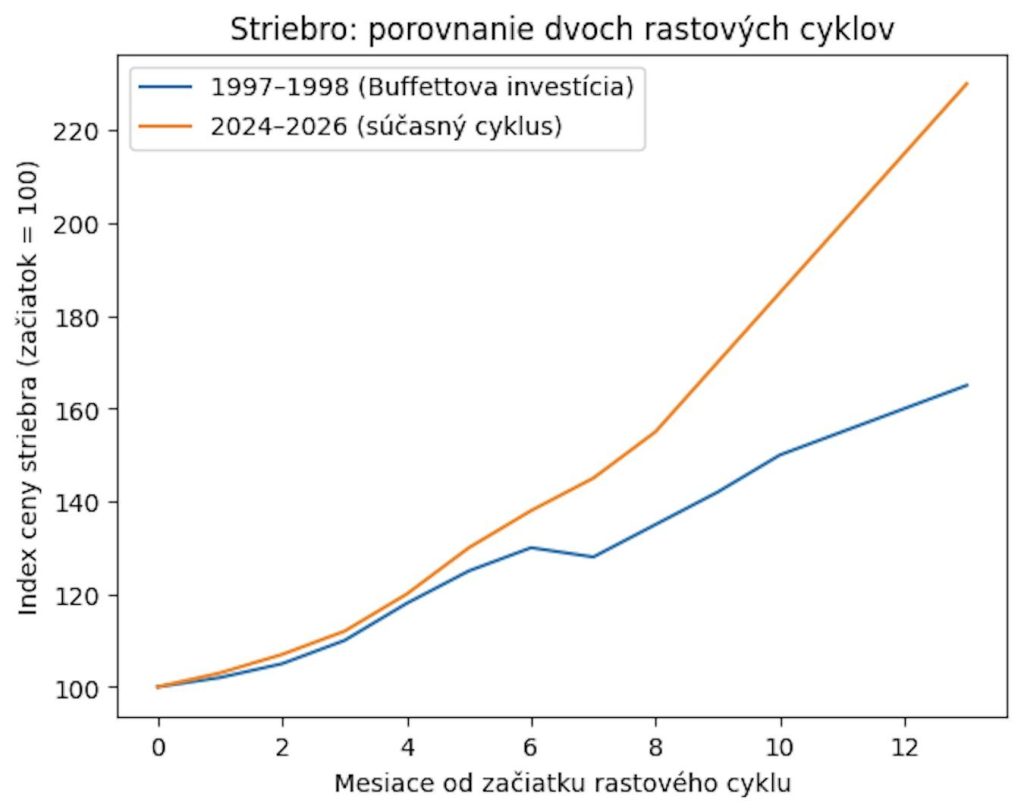 Graf porovnáva vývoj ceny striebra počas Buffettovej investície z konca 90. rokov so súčasným rastovým cyklom. Priebeh oboch kriviek naznačuje, že trh dnes vysiela veľmi podobné signály ako pred 28 rokmi.